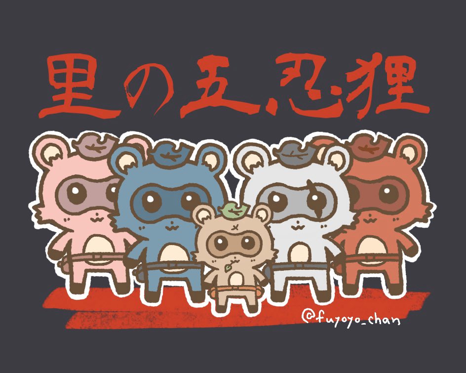 里の精鋭「五忍狸(ごにんだぬき)」🍃 中央には厳しい修行を乗り越えたぽんぽこの姿が。 他のメンバーはぽんぽこと比べて少し大きいベテラン忍者狸だ! #ぽこあーと