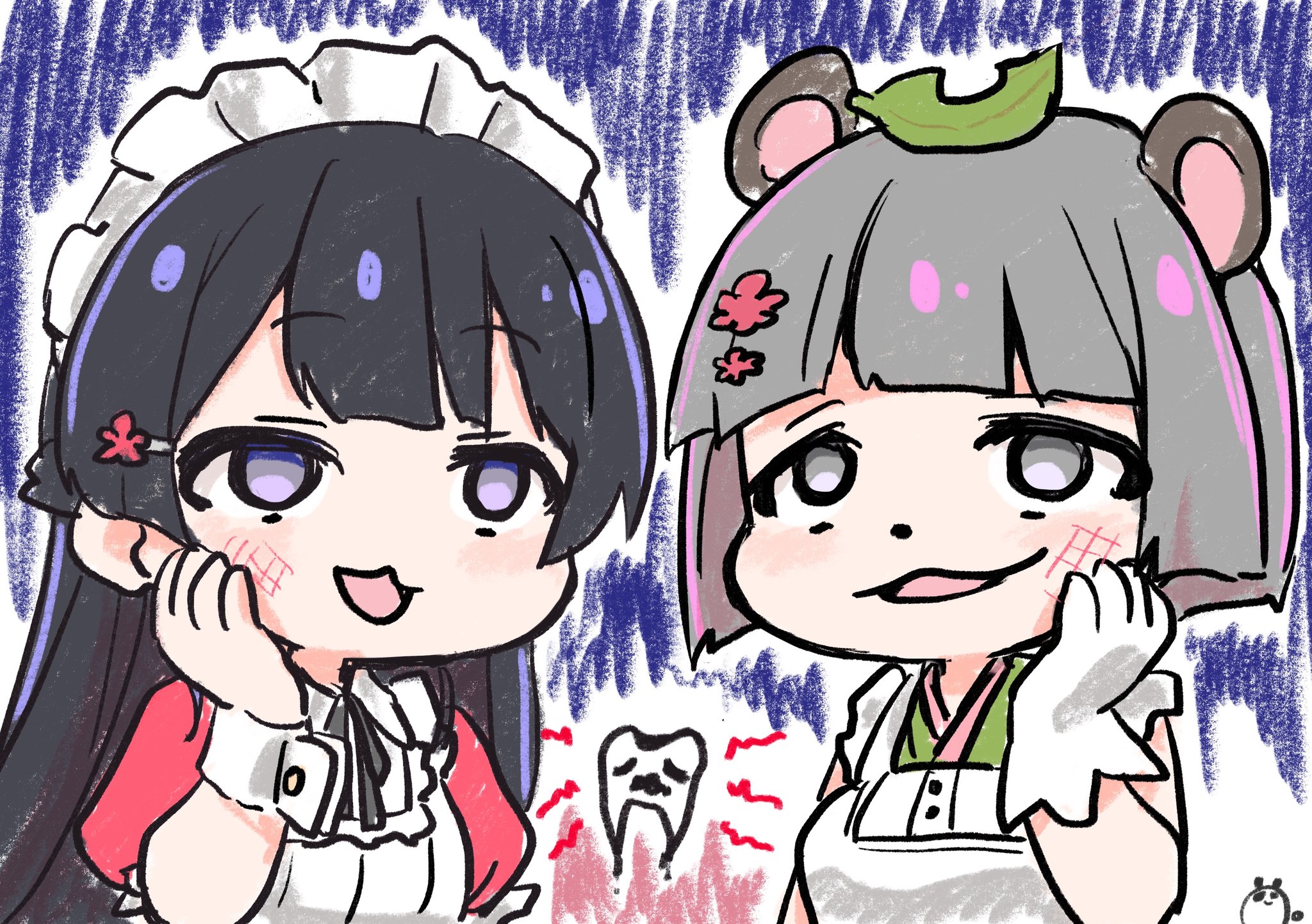 歯の神経死んでる話してた時ふたりともメイドだったから並べたらめっちゃ色味とかあうのでは!?という気付きを得た美兎ちゃんとぽんぽこさん…🐰🦷🦝 #みとあーと #ぽこあーと