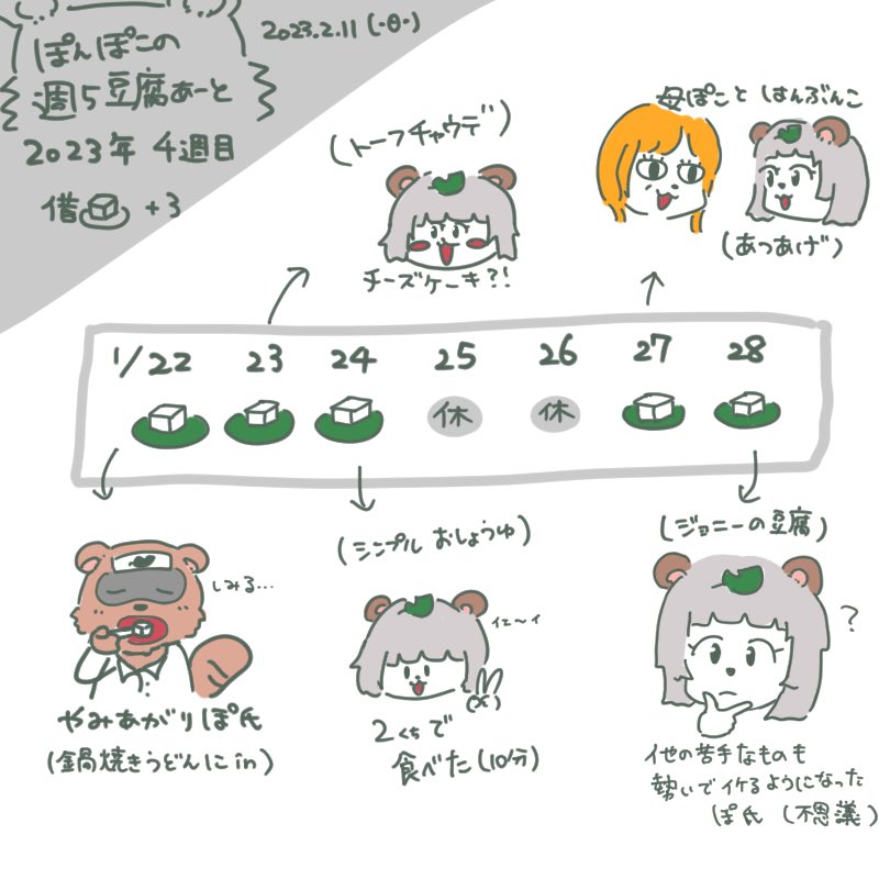 #ぽこあーと #ぽんぽこの週5豆腐あーと お久しぶりですやっと4週目 ぽんぽこちゃんのツイート見ながら描いてるんだけどお腹空く