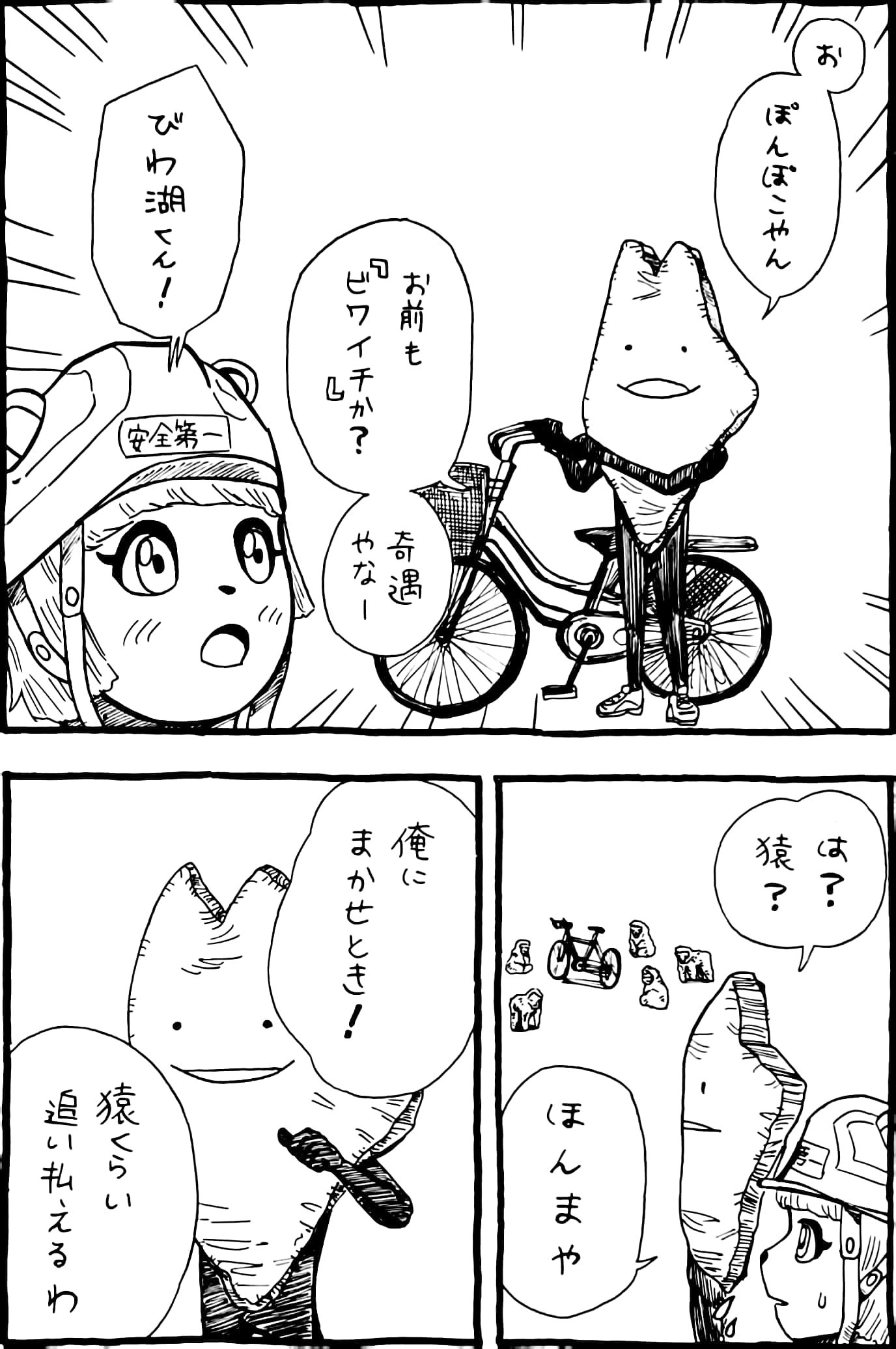 ビワイチに挑戦するぽんぽこさん漫画 #オシャレになりたいピーナッツくん #ぽこあーと #びわ湖くん