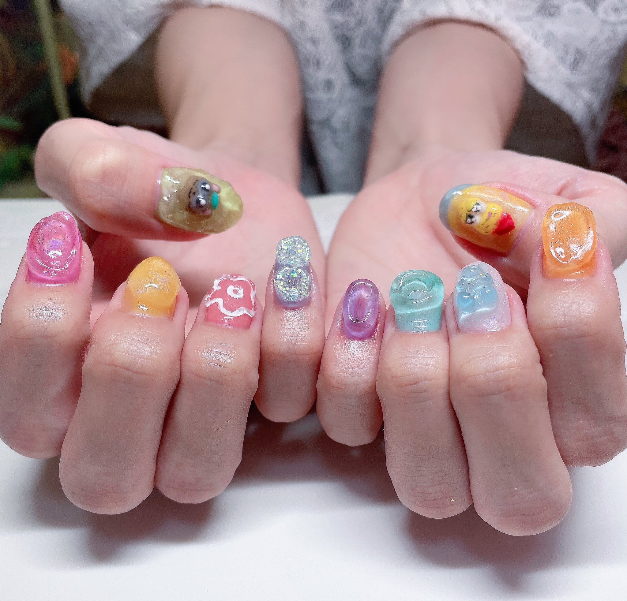 来月は、ぽこぴーの催事が盛り沢山なので デザインおこして概念ネイルにした🍃🥜 全体的にグミっぽいPOPな雰囲気にして 3Dキャラパーツ、グミベア、ぽんぽこの手拭いの柄、ダイソーロゴの色を入れ込んだ💅 可愛い〜〜!!!🔥 #ぽこあーと