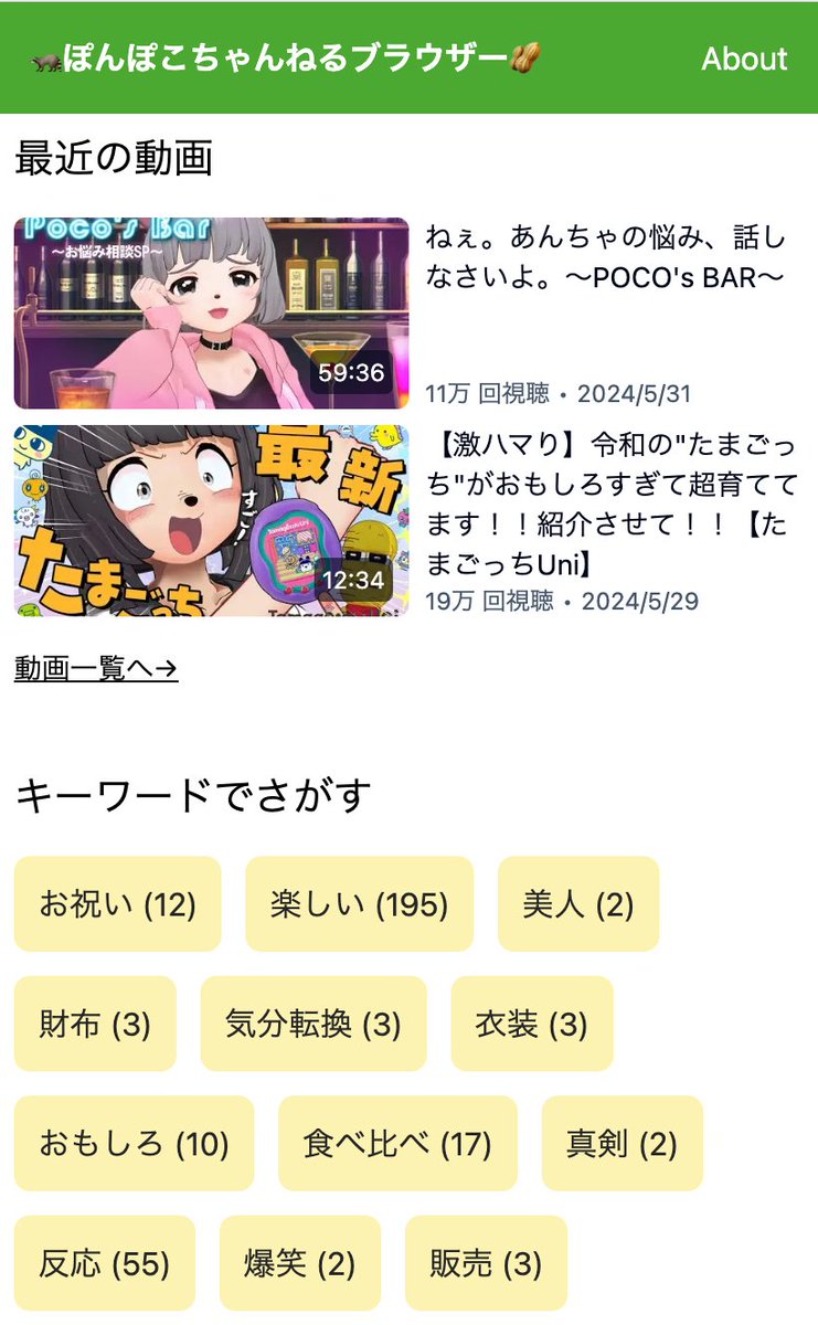 https://ponpoko.miyasui.com ぽんぽこちゃんねるの動画をいい感じに探せるサイトを作りました🦝 キーワードで絞り込んだりできます。 まだ観ぬ過去動画を漁るのに便利な気がします🥜 #ぽこあーと