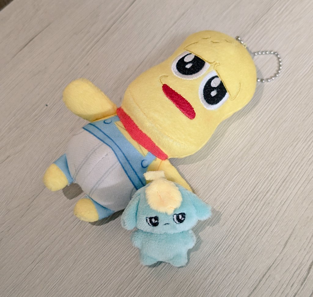 まえがみバナナっちつくった〜! 全長4cmのちみちみサイズ、ピーナッツくんと並べるとこのサイズ感 ぽこピーの生殺与奪権を握る覚悟がないので、この子を育てていこうと思います #ぽこあーと #ぽこピーたまごっち