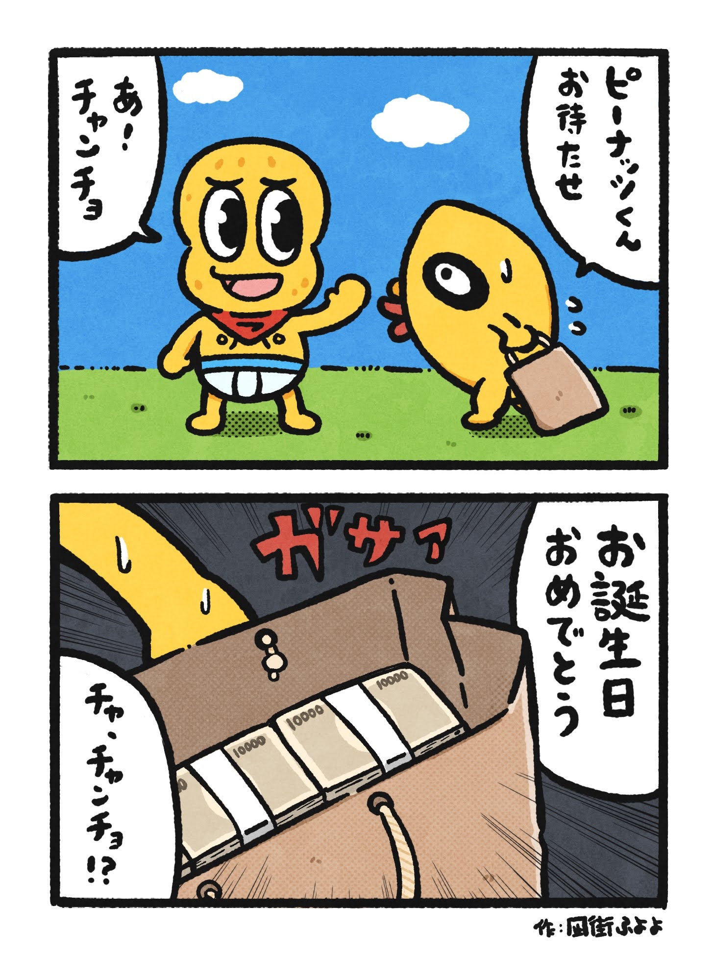 ぽこピー2コマ劇場🍃🥜 第50回『チャンチョのプレゼント』 ㊗️連載50回!!読んでくださる皆さまのおかげ続いております✨️ 最初は第30回目で終わろうと思ってましたが、第100回を目指して頑張ろうと思います🌟 #ぽこあーと #オシャレになりたいピーナッツくん