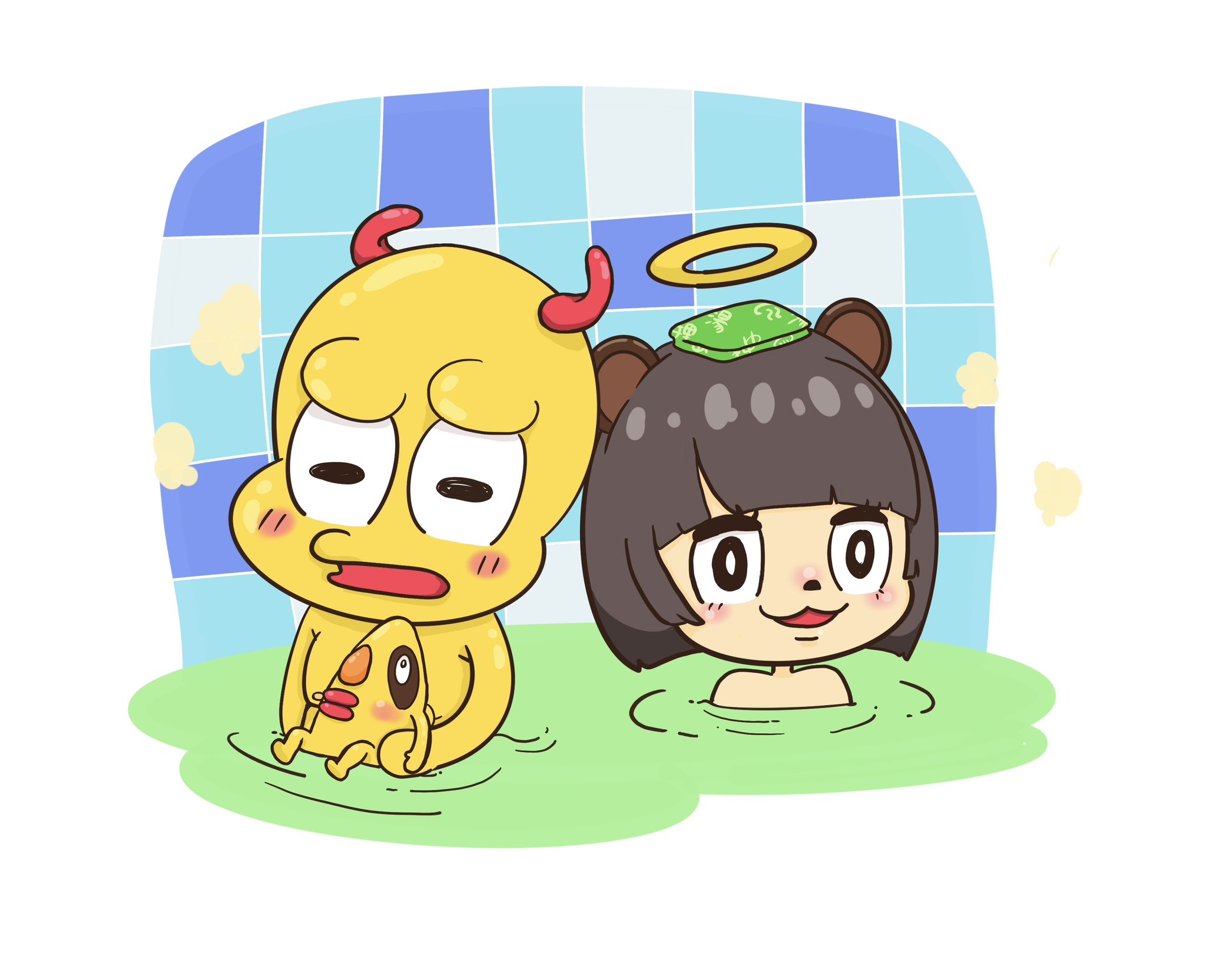 ヒト型がすごい苦手だったけど ぽんぽこちゃん描きたくてひたすら練習 した結果…どうなんでしょうか… 湯船に影を書き忘れました #ぽこあーと #オシャレになりたいピーナッツくん #チャンチョ #獄楽湯 #ぽこピーの獄楽湯 #極楽湯