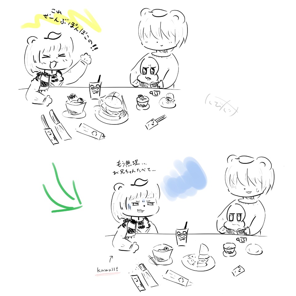 ラグーナではしゃいでコラボフードにテンションが上がるも食べきれずに残りを兄ぽこに押し付けるぽんぽこがいたらとても可愛いなという妄想落書き(美味しいから普通に完食しそう、それはそれで良い) #ぽこあーと